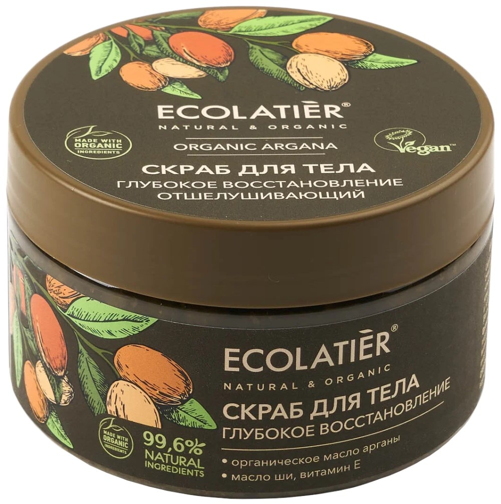Скраб для тела ECOLATIER® Organic Argan сочетает в себе эффективное и мягкое очищение с интенсивным уходом, микромассажем, кровообращением и регенерацией клеток.