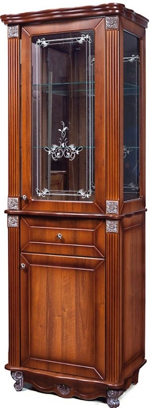 Шкаф с витриной КМК 0441.8 Баккара 2Д1Я — удивительно красивая модель, которая станет изюминкой интерьера гостиной. Верхняя часть со стеклом может служить витриной наград и кубков, выставкой фамильного фарфора или коллекций. Нижняя часть — отличное место для хранения посуды, книг, или различных необходимых предметов.