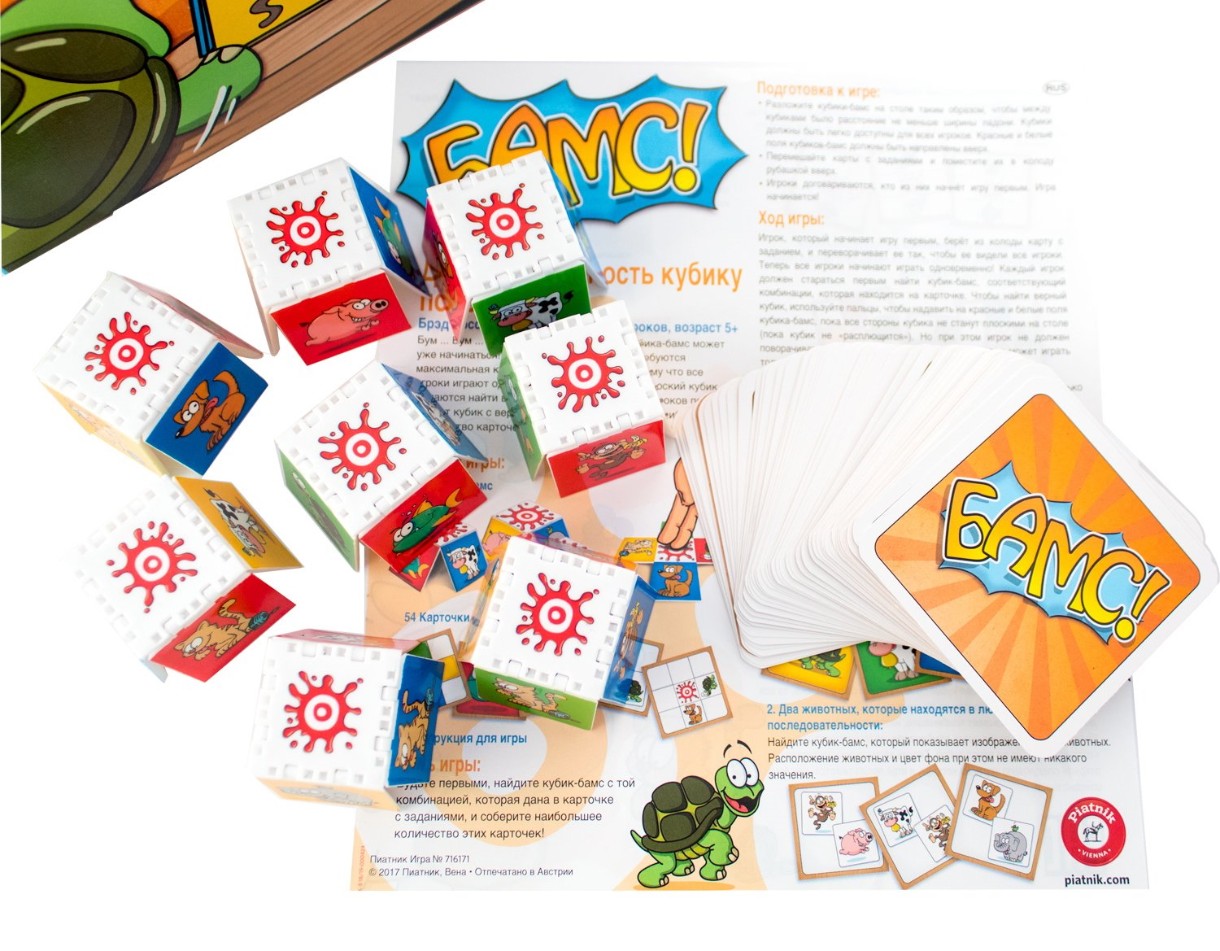 Комплектация8 кубиков-бамс, 54 карточки, инструкция