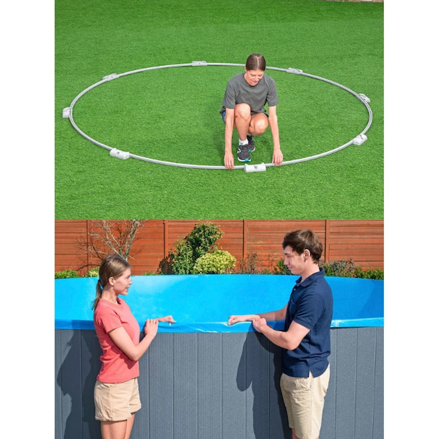 Бассейн изготовлен из усиленного винила (PVC) с каркасом из оцинкованной стали, что гарантирует долговечность, устойчивость к коррозии и надежность эксплуатации.