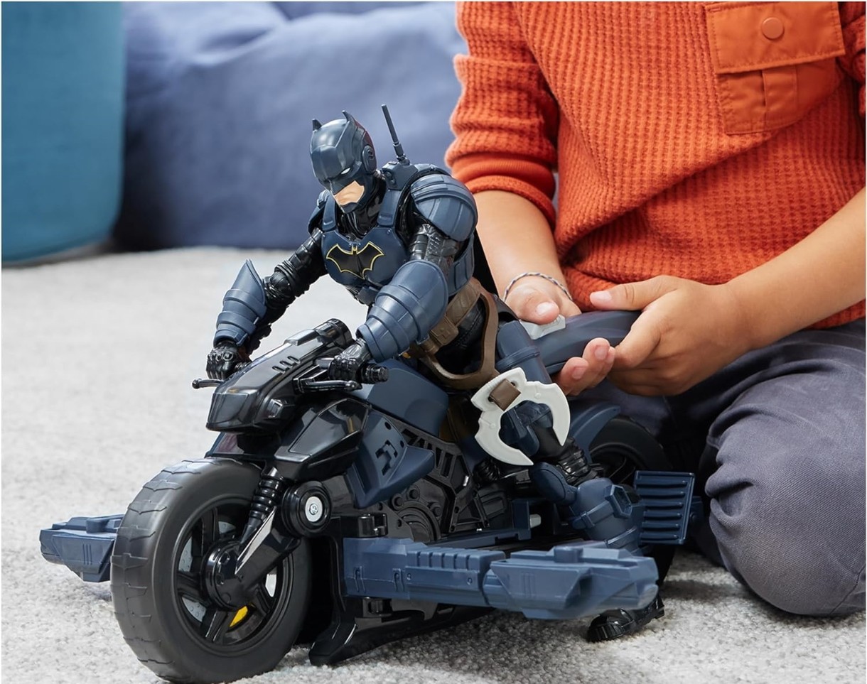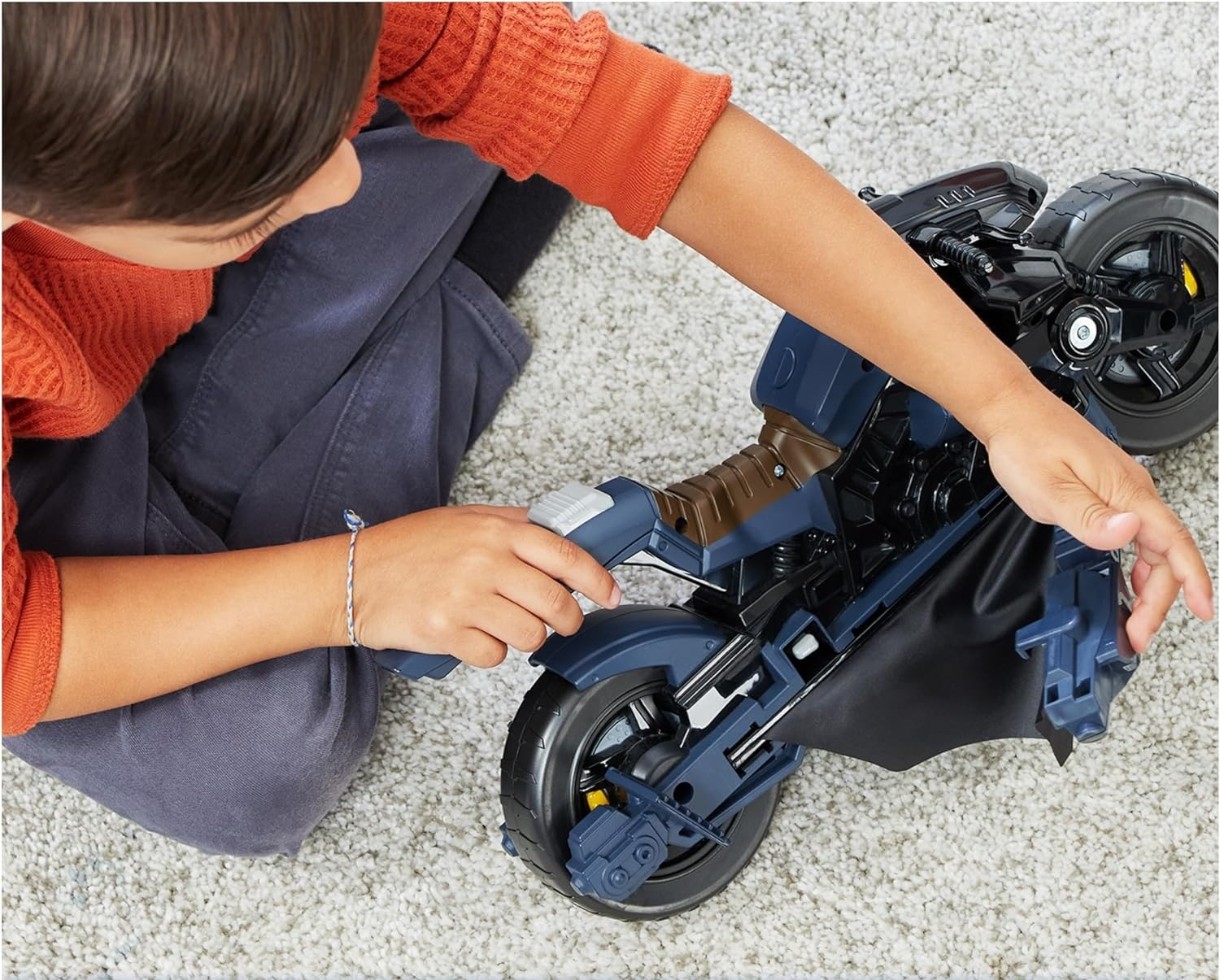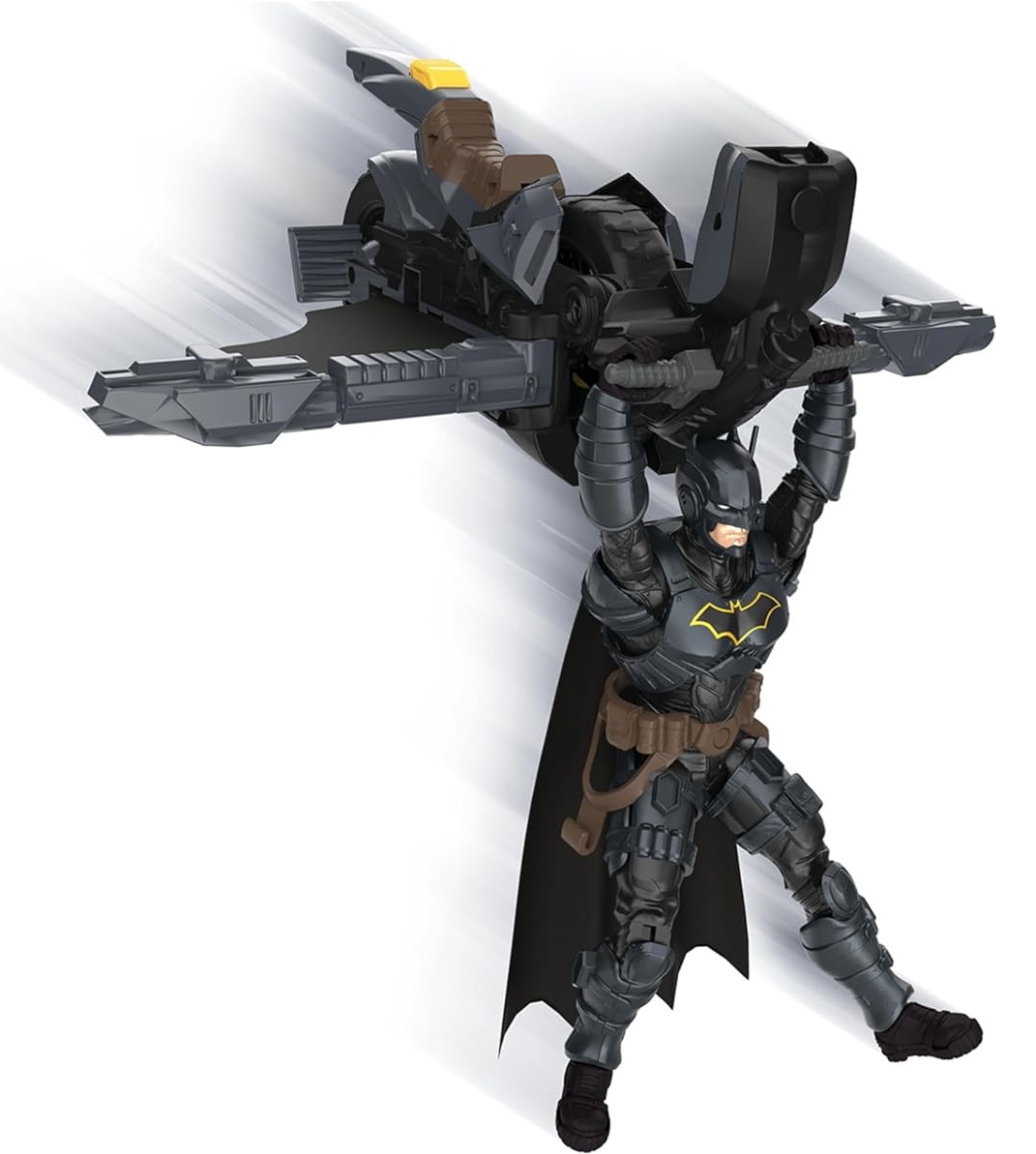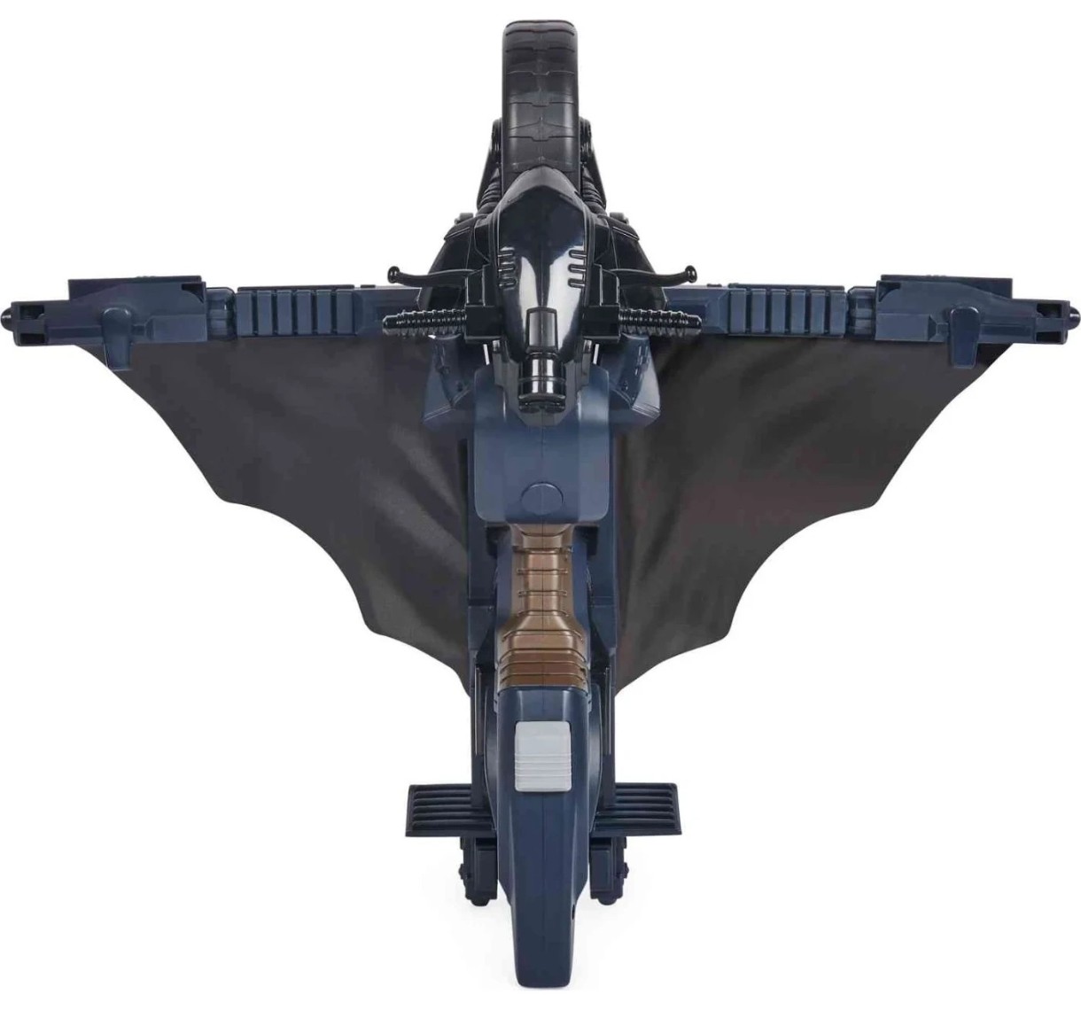 Мы добавляем действия на земле и в воздухе с помощью универсального бэтцикла Бэтмена, который трансформируется в бэтпланер, предлагая безграничные возможности для захватывающих приключений супергероя. Бэтцикл рассчитан на любую фигурку Бэтмена ростом 30 см, что позволяет детям брать с собой в бой своих любимых супергероев.
