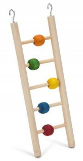 Хорошая деревянная лестница с цветными бусами вокруг ступеней. Сверху крепятся два крючка, чтобы легко повесить лестницу на решетку клетки.