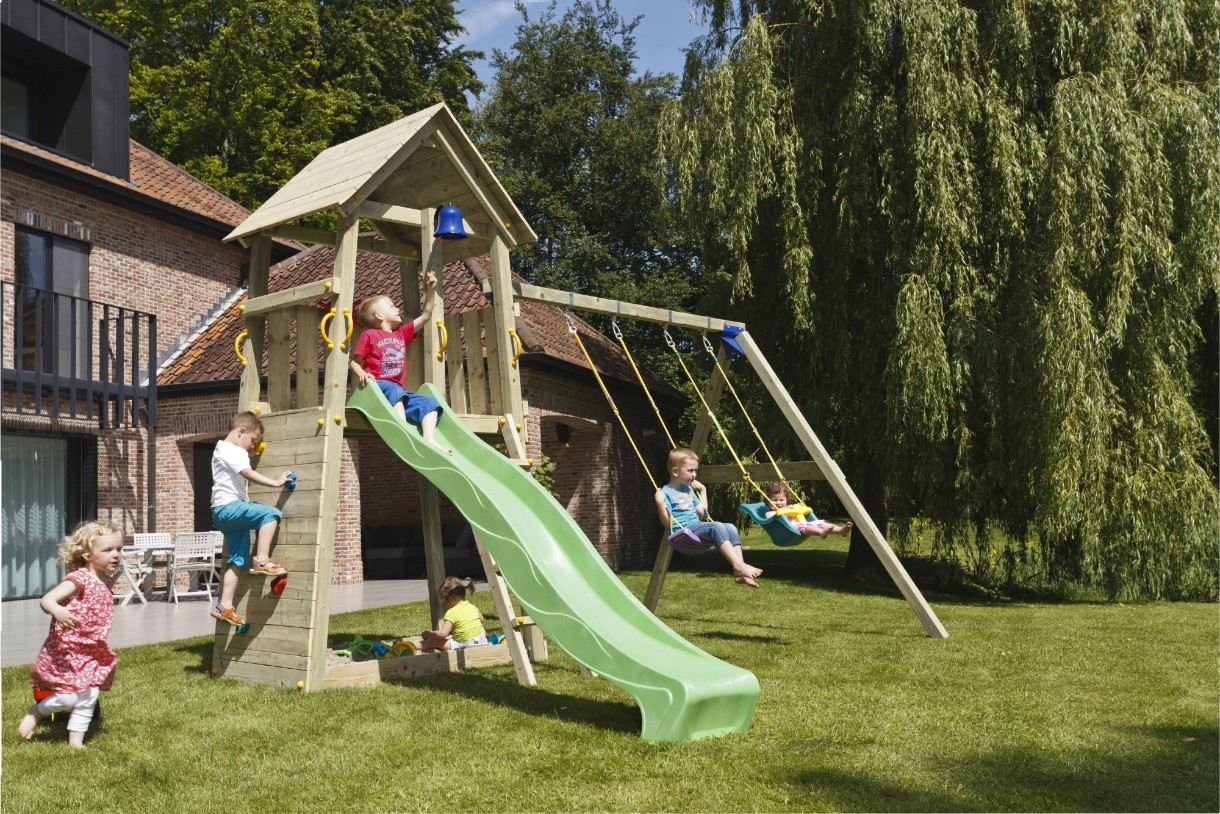 Детский игровой домик с горкой BELVEDERE+Swing предназначен для использования в частных дворах и на дачах и является отличным соотношением цены и качества. Комплекс имеет деревянную конструкцию. Наклонная конструкция, стена для скалолазания и двойные качели придают башне BELVEDERE+Swing особенный вид.