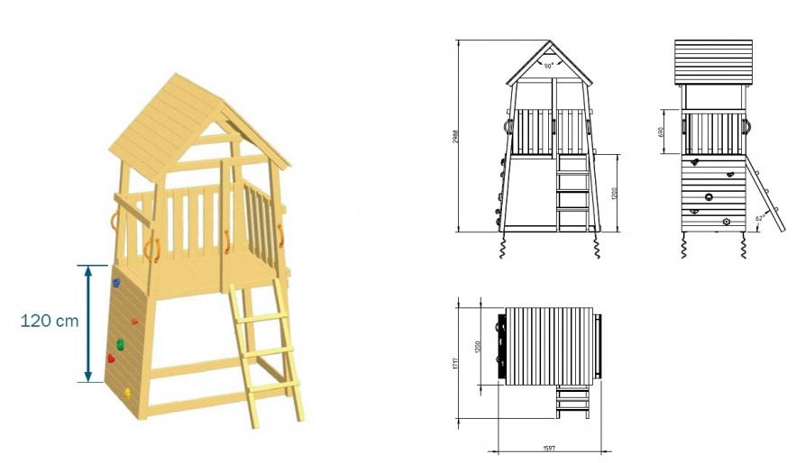 Материал: сосна. Столбы домика сечением 80мм х 80мм и 90мм х 90мм. Комплекс крепится к земле с помощью анкеров (без бетонирования). Материал покраски: система защиты дерева с эффектом самоочистки Pinotex Extreme (Нидерланды). Сверхпрочная защитная лазурь для древесины Pinotex Extreme защищает деревянные поверхности от агрессивного воздействия осадков и ультрафиолета даже в условиях сурового климата.