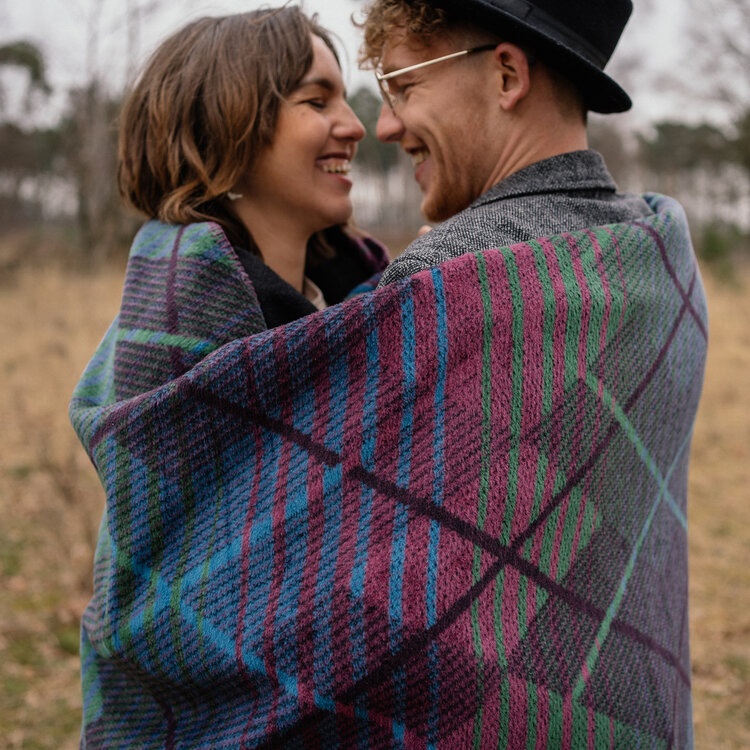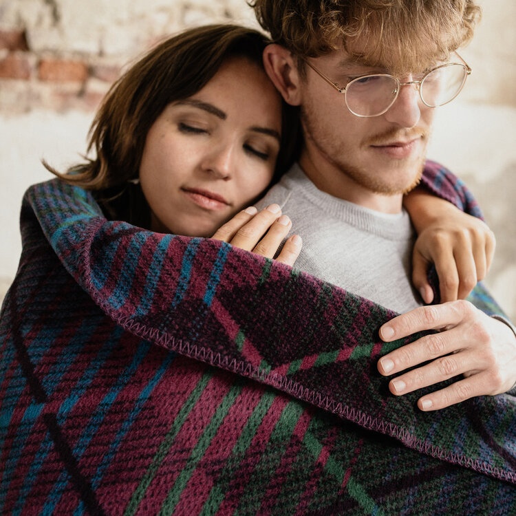 Плед в оттенках синего, зеленого и фиолетового с прорисованными геометрическими фигурами и полосками очень мягкий и приятный на ощупь. Он изготовлен из смеси акрила и хлопка, что делает его очень уютным и обеспечивает комфортный отдых. Он особенно хорош для весеннего утра и долгих зимних вечеров, потому что он плотный и хорошо сохраняет тепло.