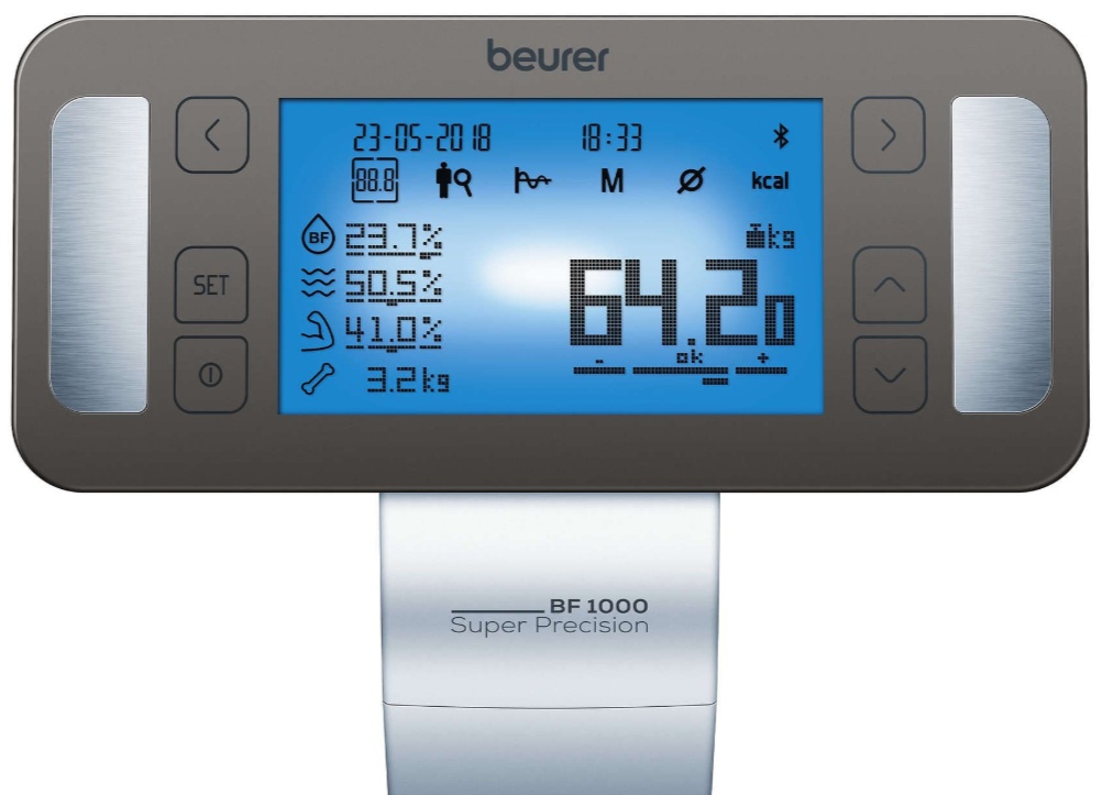 Новая модель BF 1000 Super Precision порадует даже самых требовательных пользователей. Эти весы оснащены восемью электродами для рук и стоп и особой функцией перекрестного измерения. В дополнение к весу, они показывают жировую и костную массу, долю влаги и мышечной ткани, а также потребность в калориях.