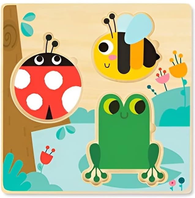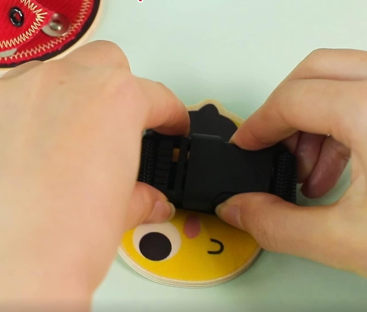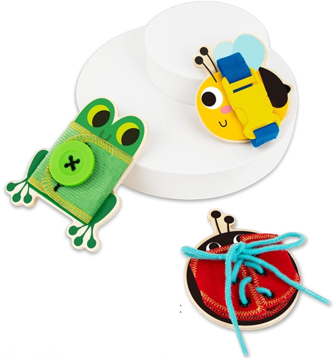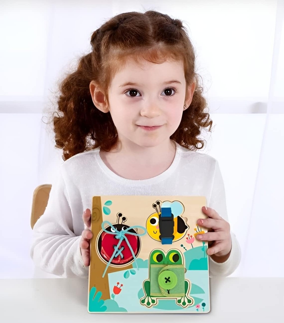 Развивающая деревянная игрушка - бизиборд "Животные" от Tooky Toy. Бизиборд состоит из деревянной основы и 3 разноцветных пазлов - вкладышей с шнуровкой, пуговицей и защелкой.