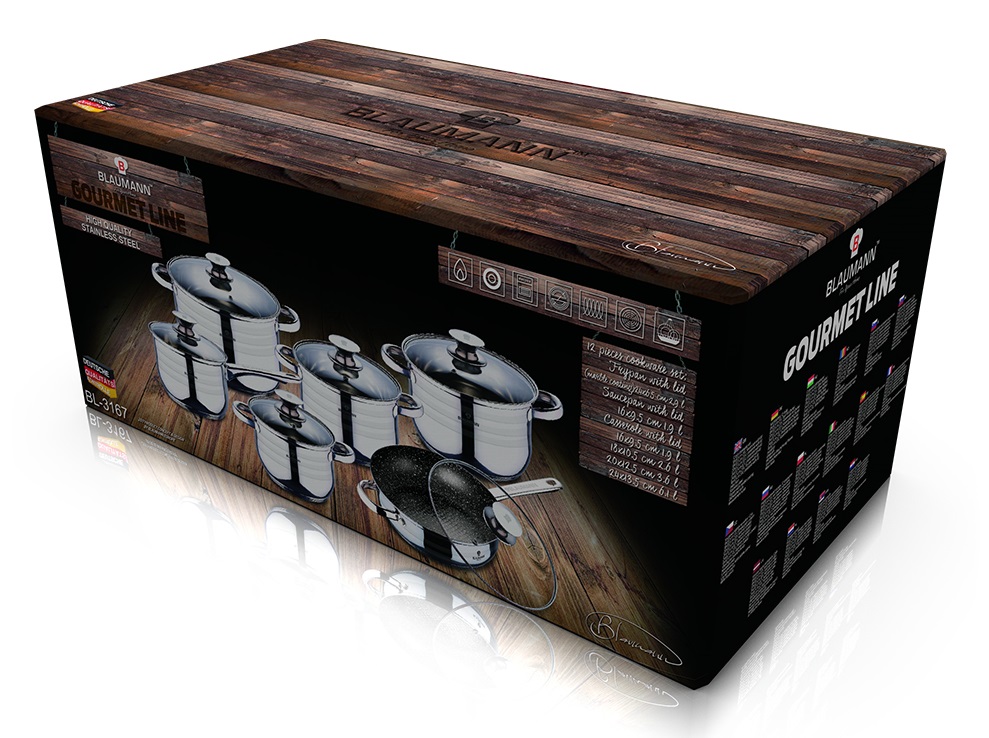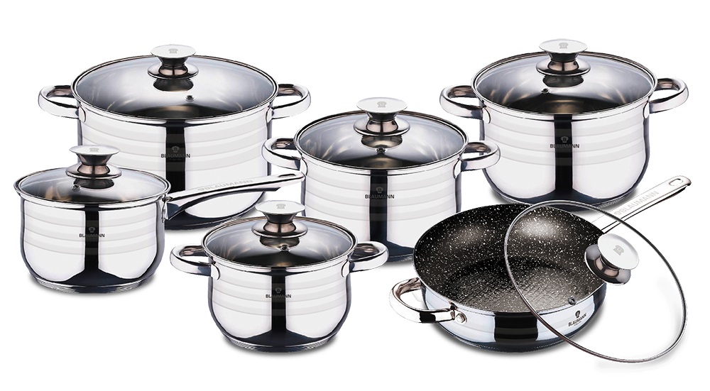 Набор посуды 12 предметов Кастрюля с крышкой: 16x9,5 см 1,9 л Кастрюля с крышкой: 18x10,5 см 2,6 л Кастрюля с крышкой: 20x11,5 см 3,6 л Кастрюля с крышкой: 24x13,5 см 6,1 л Сковорода с антипригарным мраморным покрытием : 24x6,5 см 2,9 л Ковш: 16x9 см 1,9 л