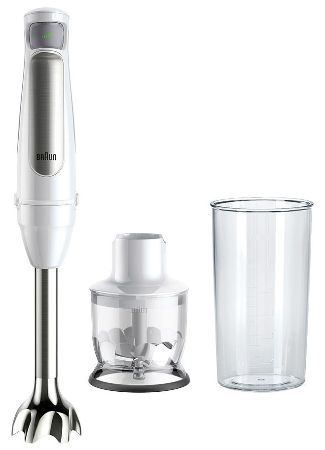 Погружной блендер Braun MQ 7020 WH имеет практичную комплектацию, которой достаточно для закрытия основных запросов по процессам на кухне. Блендерная ножка, выполненная из нержавеющей стали, отлично сможет сделать суп-пюре, или же, какой-то соус. К тому же, благодаря уникальной форме, можете быть спокойны за чистоту поверхности, где используется прибор. Купол уникальной формы защищает от брызгов во время работы. Также, в комплектации присутствует измельчитель объёмом на 350 мл, венчик и мерный стакан со шкалой, объёмом в 600 мл.