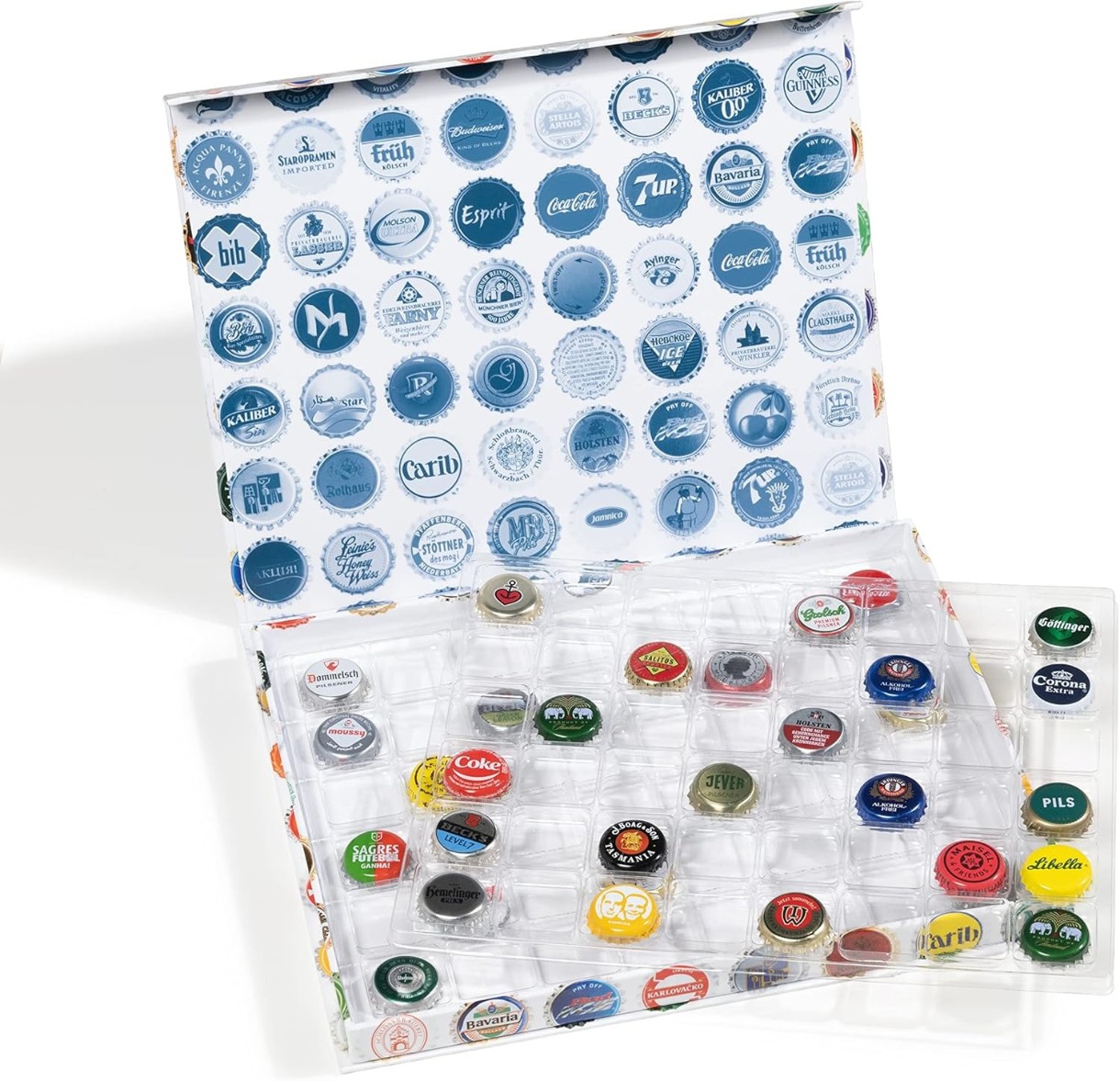 Коробка (бокс, кассета) для пивных пробок, крышек, кроненпробок (367179). Материал: плотный картон с оклейкой дизайнерскими материалами. Подходит для надежного размещения 96 пивных пробок (кроненпробок) или крышек от шампанского (крончатых колпачков). В коробке два вкладыша, которые удобно складываются друг на друга и адаптированы под стандартный размер кроненпробки.