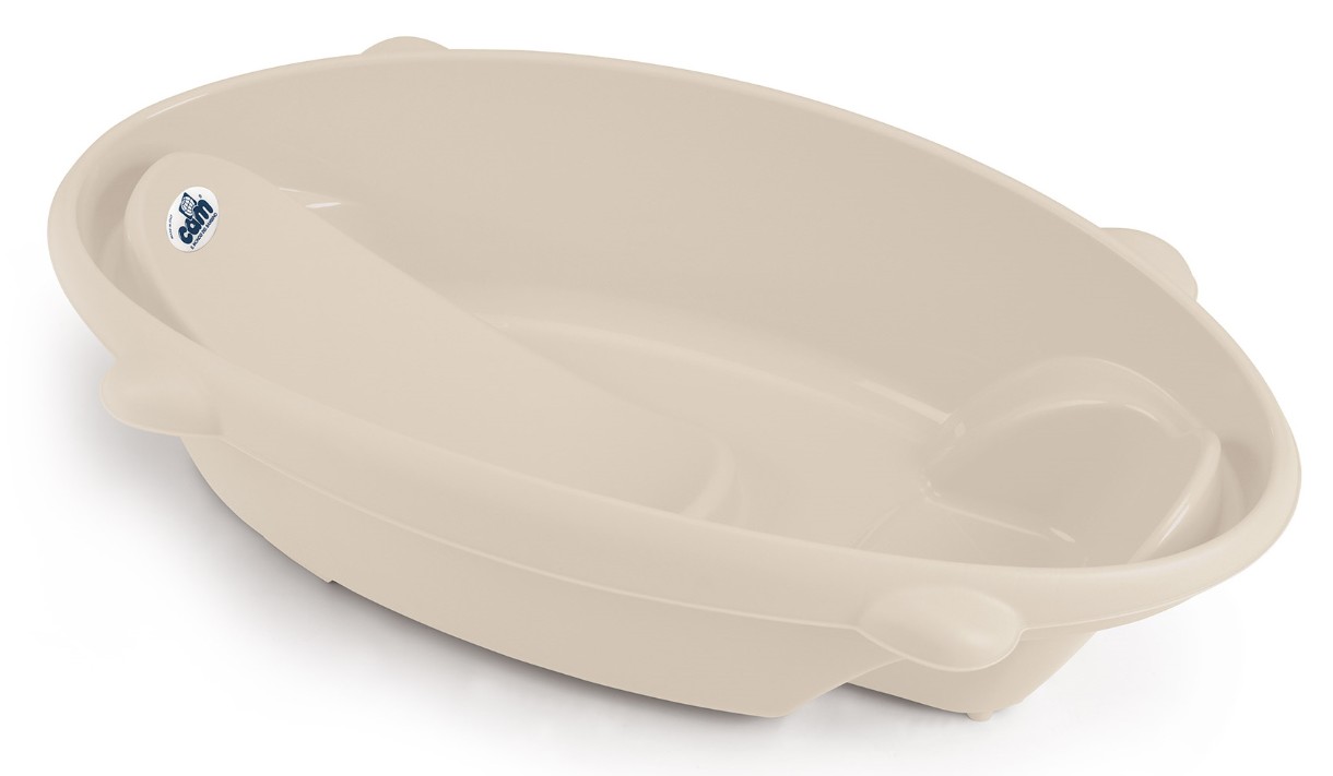 С двумя анатомическими сидениями, одно под наклоном для детей от 0 до 6мес, второе для положения сидя с подлокотником для детей 6-12мес., устойчивое дно, сливное отверстие.