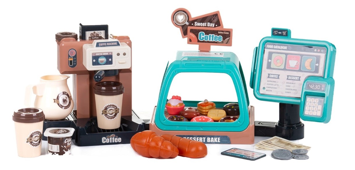 Включает 41 единицу отдельных игрушек и аксессуаров - кофемашина с резервуаром для воды, чашки и пресс для кофе, монеты и банкноты, экран с POS, витрина для десертов.