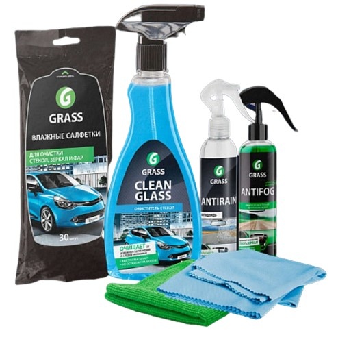 Набор по уходу за стеклами Grass Maxi — универсальный комплект из пяти средств и аксессуаров. В набор входят: Универсальный очиститель стекол Clean Glass 500 мл. Подходит для стекол, зеркал, пластика, хрома. Не оставляет подтеков и разводов, экономичен в применении. Придает поверхности антистатические свойства. Антизапотеватель Antifog 250 мл. Средство для предотвращения запотевания стекол и зеркал автомобиля. Антидождь Antirain 250 мл. Водо- и грязеотталкивающее средство для стекол зеркал, фар автомобиля и любых других стеклянных поверхностей. Салфетка для стекол и зеркал Magic Glass. Идеальна для мытья окон, автомобильных стекол, зеркал, хрусталя, оптики и любых других гладких поверхностей от кафеля до драгметаллов. Влажные салфетки из плотной крепированной бумаги. Предназначены для очистки автомобильных стекол, зеркал, других стеклянных поверхностей. Не оставляют разводов за счет использования специального целлюлозного материала для полировки поверхности. Универсальная салфетка для дома и автомобиля. Прекрасно справится с грязью, пылью, впитает большой объем воды, масла, жиры.