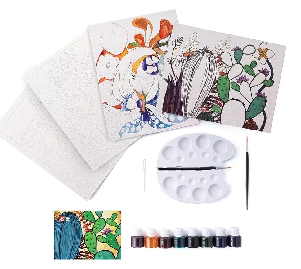 Комплектация8 акварелей, палитра, 2 кисти, дозатор, 2 предварительно напечатанных произведения искусства, 2 предварительно напечатанных произведения искусства в технике воскового контура, подробное иллюстрированное руководство по изучению техники акварельной живописи