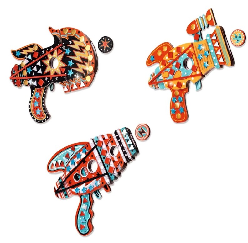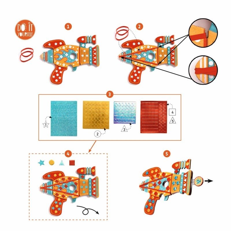 Набор для творчества, состоящий из трех шутеров-пусковых установок, которые можно украсить мозаичными наклейками. Дети размещают стикеры в соответствии с цифрами на пусковых установках. Как только все три будут завершены, все, что вам нужно сделать, это вооружиться жетонами и отправиться покорять галактику! Занятие, которым можно наслаждаться в одиночку или с другими.