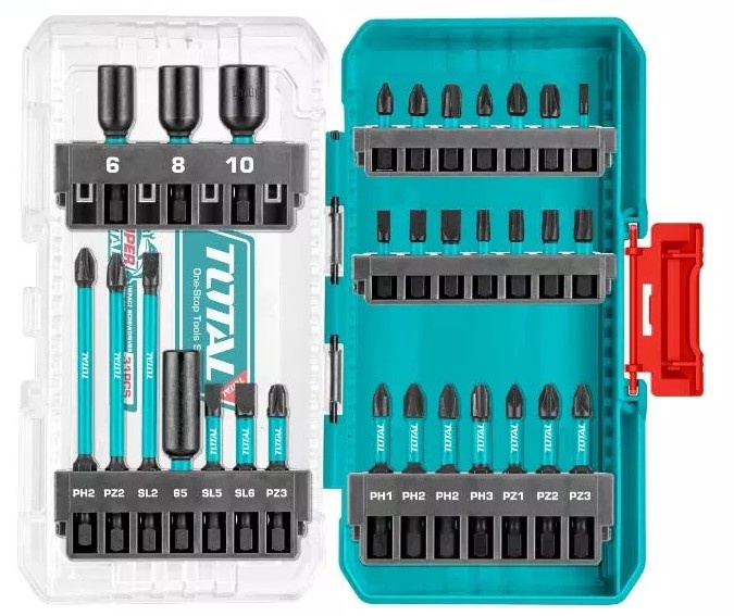 Набор ударных бит 31 шт. Total TACSDL11306 — это профессиональный комплект для работы с ударными шуруповертами. Включает 30 бит длиной 25 мм из хром-ванадиевой стали (типы: PH, PZ, SL, Hex, Torx) и магнитный держатель. Прочные, устойчивые к нагрузкам биты поставляются в удобном пластиковом кейсе. Подходит для интенсивных задач в ремонте и строительстве.