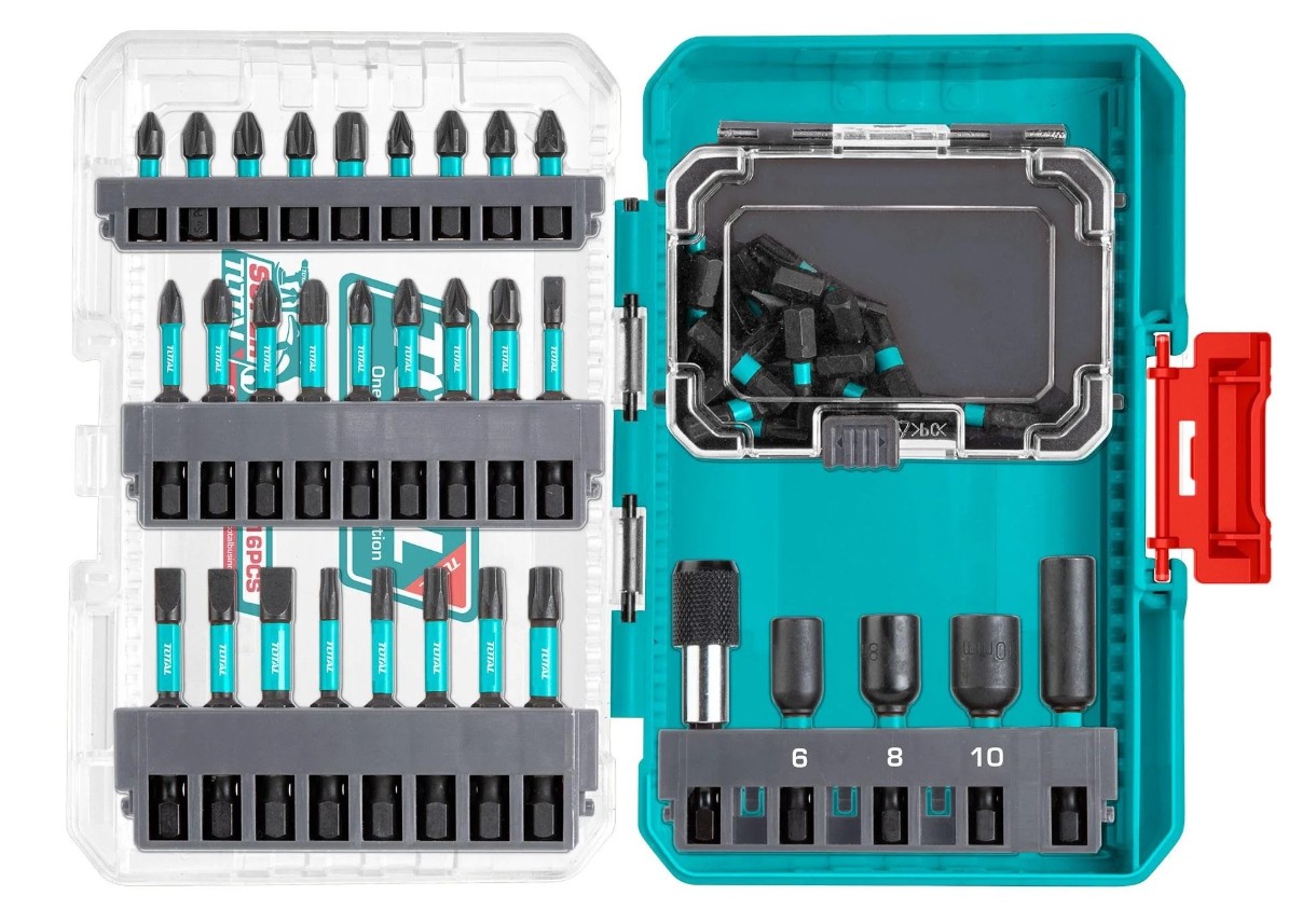 Набор ударных бит 51 шт. Total TACSDL25106 — это профессиональный комплект для работы с ударными шуруповертами. Включает 50 бит длиной 25 мм из хром-ванадиевой стали (типы: PH, PZ, SL, Hex, Torx) и магнитный держатель. Прочные, устойчивые к нагрузкам биты поставляются в удобном пластиковом кейсе. Подходит для интенсивных задач в ремонте и строительстве.