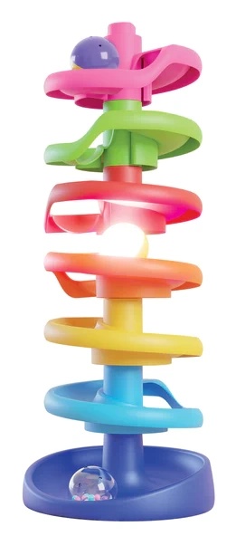 Башня, состоящая из множества красочных элементов, с большим основанием, чтобы держать все это в устойчивом равновесии. Разноцветные шарики бегут по спиральной дорожке и развлекают всех детей. В одном из шаров есть свет.
