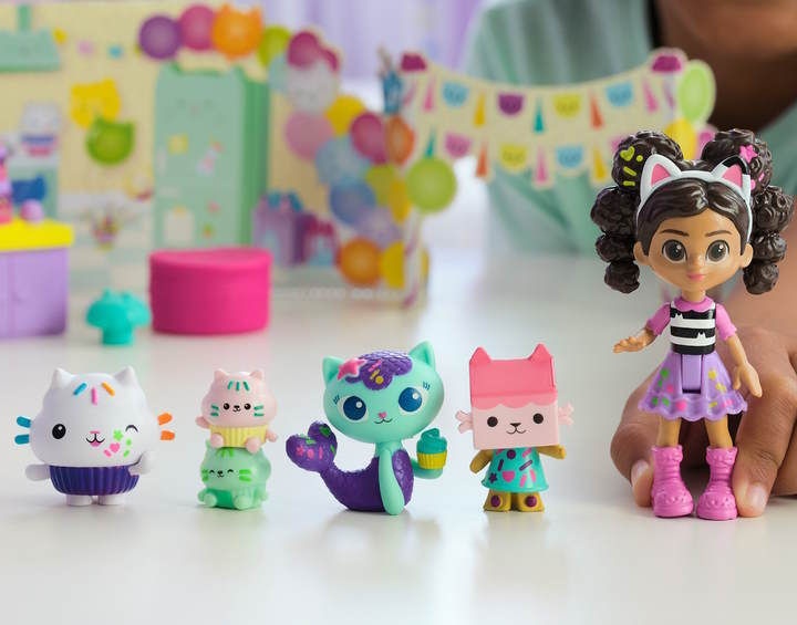Набор фигурок Cakey Cat Birthday представляет персонажей из мультфильма «Кошачий домик Габи». Герои этого сериала готовятся к кошачьему дню рождения.