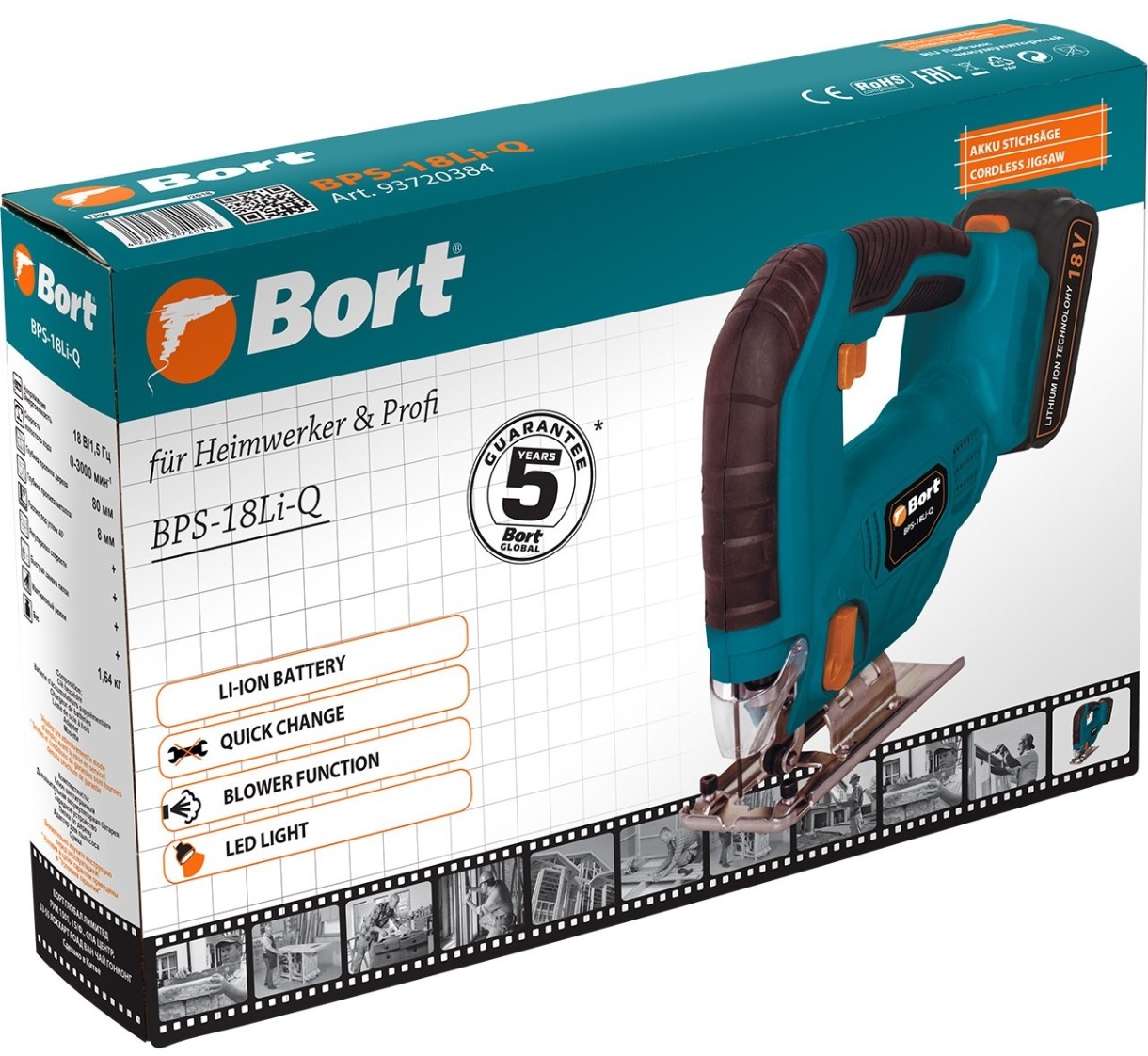 Аккумуляторный лобзик Bort BPS-18Li-Q легко справится с прямыми и фигурными пропилами по дереву различной плотности и металлу. Маятниковый механизм обеспечивает эффективную работу инструмента, а регулировка скорости позволяет точно и аккуратно распиливать любые материалы. Есть функция «быстрой замены пилок», которая позволит сэкономить время на установку оснастки. В процессе работы поверхность материала остаётся чистой, благодаря функции сдува опилок. Эргономичный корпус, небольшой вес и прорезиненная рукоятка обеспечивают комфортную работу с инструментом. Литий-ионный аккумулятор держит заряд батареи долгое время благодаря отсутствию саморазряда. Предусмотрена защита от случайного включения. Наличие подсветки рабочей зоны поможет эффективно выполнить работу в условиях недостаточного освещения. Аккумуляторная батарея совместима с BRS-18Li-FD. В комплект входят шестигранный ключ, параллельная направляющая, дополнительная аккумуляторная батарея, зарядное устройство, пилка по дереву, пилка по металлу, адаптер для пылесоса, удобная сумка для хранения и транспортировки.