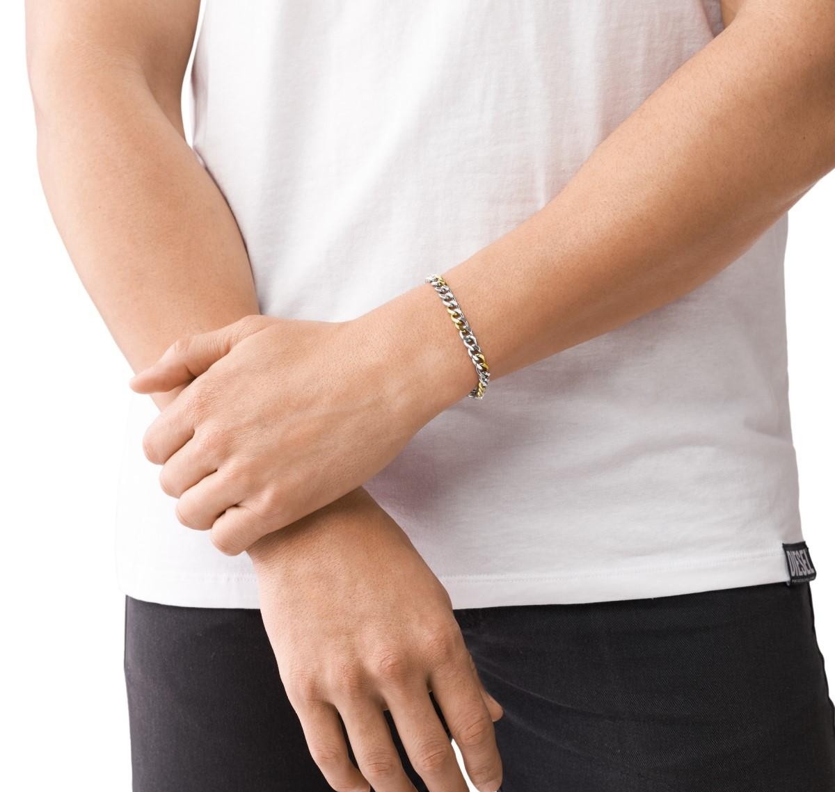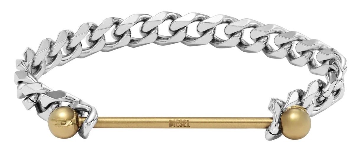 Стильный браслет Diesel выполнен из нержавеющей стали, замок-цепочка со звеньями шириной 8 мм имеет оттенок желтого золота и логотип Diesel.
