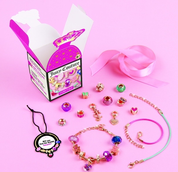 Потрясающе модные и совершенно неожиданные! В этих коробках Juicy Couture DIY Dazzling surprise содержатся материалы для создания 3 браслетов Juicy Couture. Великолепные дизайны, интересные подвески и масса удовольствия для каждого юного дизайнера. 5 различных наборов по 3 браслета означают, что вы можете сделать до 15 уникальных браслетов, если найдете все 5 наборов! Бисероплетение, плетение, цепочки и подвески - все это создает великолепные образы! Обратите внимание на редкий металлический браслет с большим шармом в виде сердца!