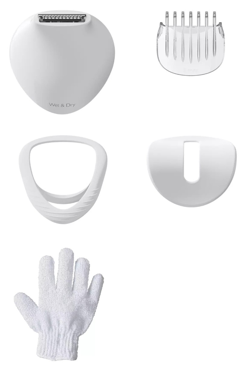 Комплектациянасадка-триммер для линии бикини, бикини-триммер с гребнем, отшелушивающая перчатка, насадка для чувствительных участков, насадка для оптимального контакта, щеточка для чистки
