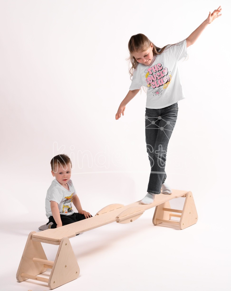 Бум балансир Kinderstar! Эта универсальная платформа функционирует как качели, скамейка, волшебная дорожка, поверхность для растяжки, сцена для выступлений, пиратская доска и многое другое.