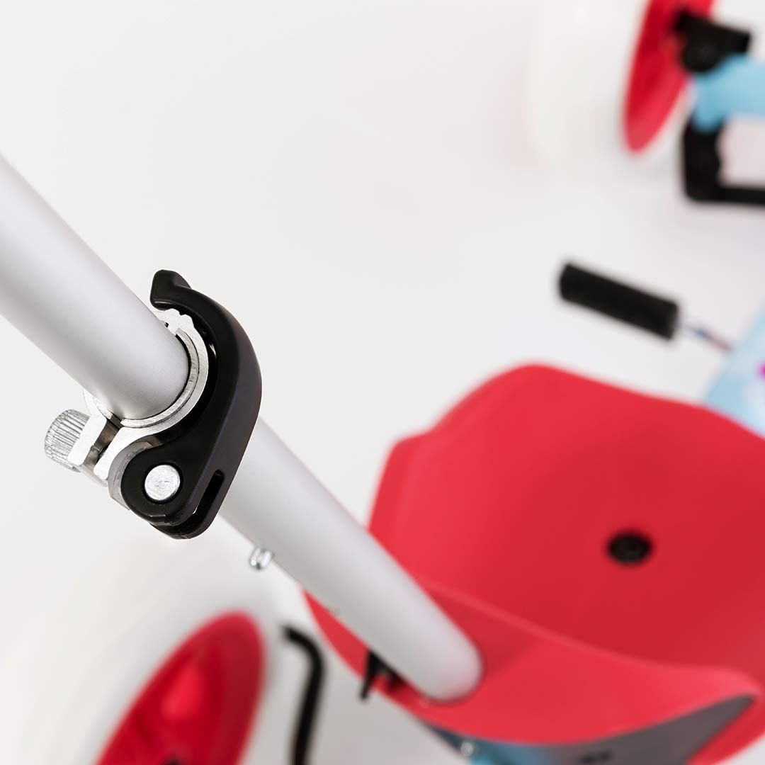 Транспорт легко преобразуется из веломобиля-картинга в каталку с ручкой и обратно. Руль веломобиля оснащен системой блокировки. Даже при заблокированном руле ребенок сможет вращать педали, так как эти узлы не зависят друг от друга.