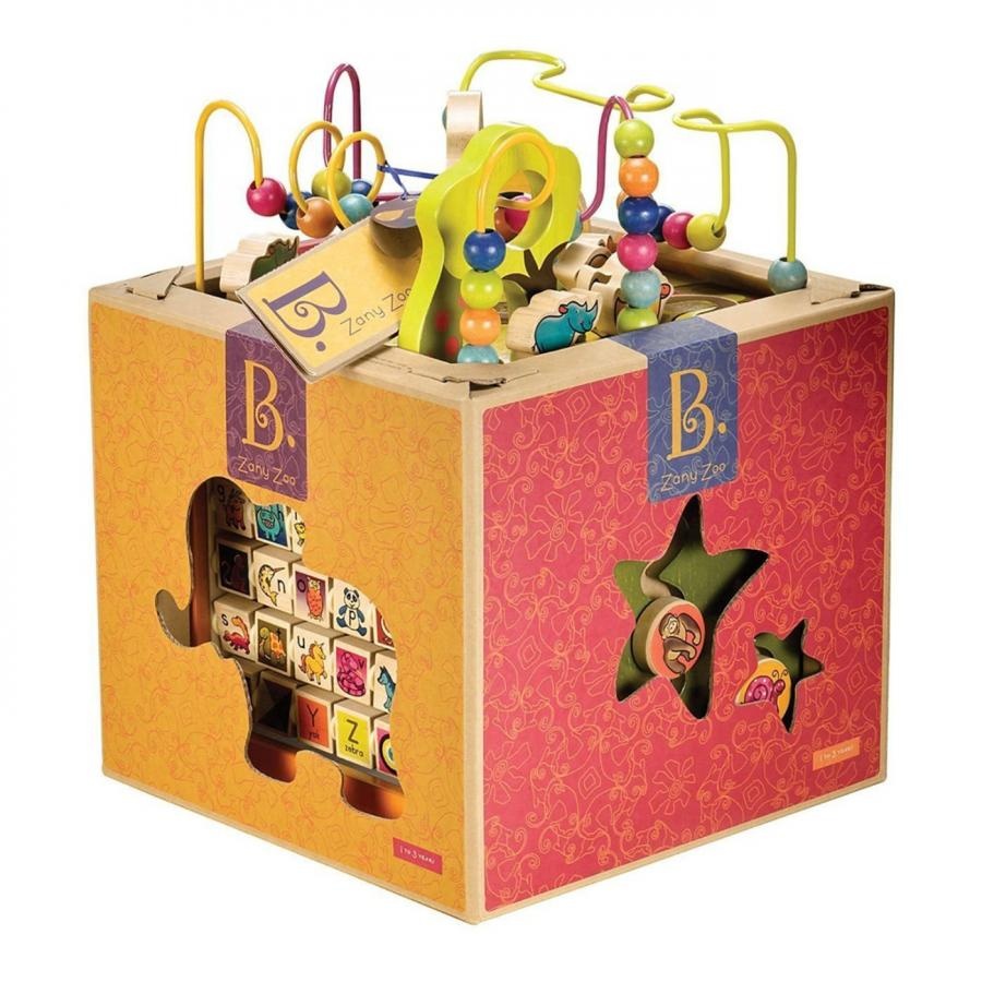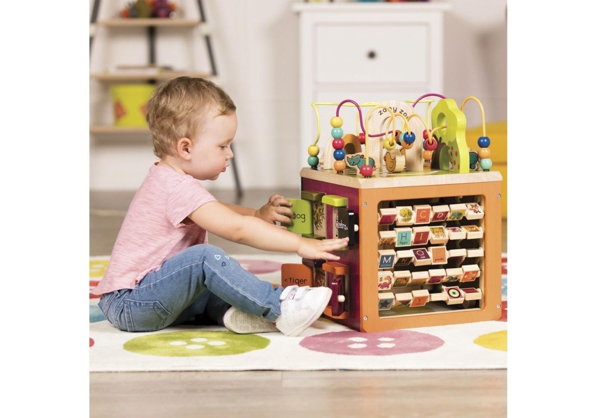 Игрушка «Зоо-куб» (арт. BX1004X) от Battat представляет собой деревянный куб с пятью активными для игры гранями. Она увлечет малыша лабиринтами, открывающимися дверками, вращающимися барабанчиками и кубиками. Героями будут симпатичные зверюшки. Играя с ними ребенок попутно будет изучать английский алфавит, развивать свои пальчики и логику.