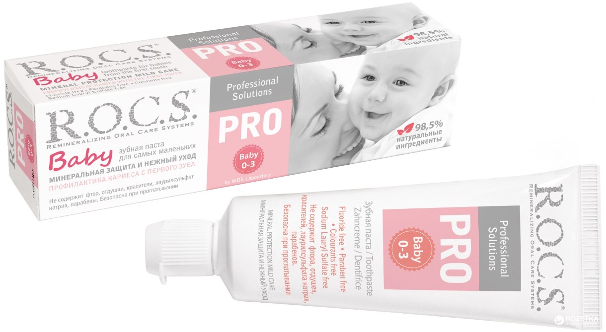 Зубная паста R.O.C.S. PRO Baby предназначена для ухода за зубами малышей, начиная с самого раннего возраста: от 0 до 3-х лет. Приготовлена на очень мягкой основе, которая, с одной стороны, обеспечивает качественную очистку зубов, а с другой стороны, не травмирует незрелую эмаль молочных зубов. 98,5% — ингредиенты натурального происхождения. Содержит ременирализирующий комплекс, такой же, как в геле R.O.C.S. Medical Minerals: ксилит (10%), кальция глицерофосфат, магния хлорид.