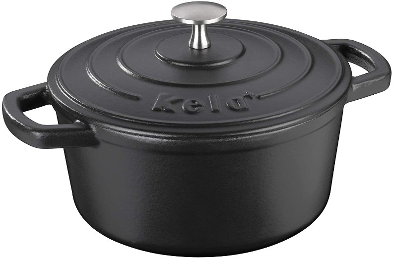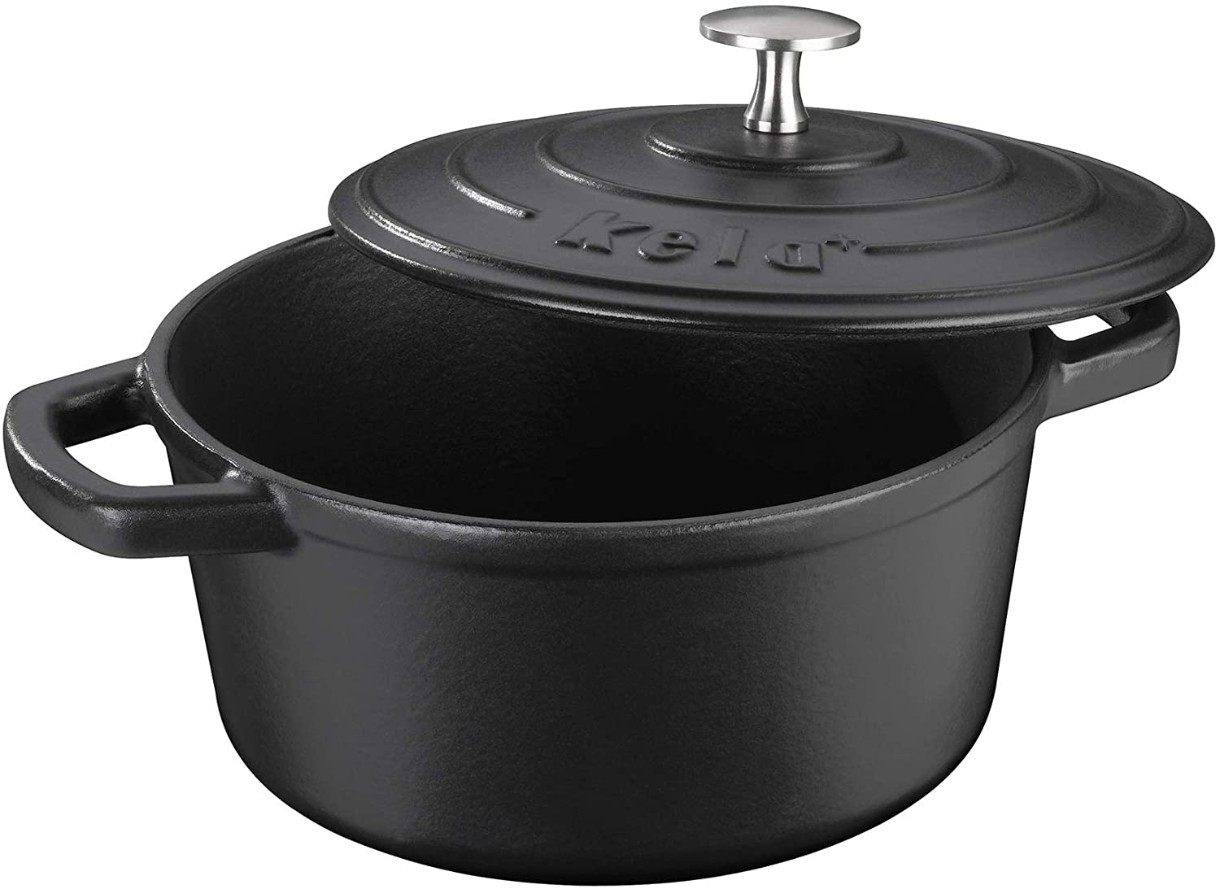 одная кухонная посуда с длительным сроком службы из серии KELA Calido: круглая чугунная кастрюля с крышкой диаметром 21 см и объемом 2,5 литра. Черная кастрюля изготовлена из чугуна и покрыта эмалью как внутри, так и снаружи, имеет глянцевое покрытие. Она идеально подходит как для обжаривания (до 300°C), так и для длительного тушения мяса в собственном соку. Подходит для всех источников тепла, включая индукционные.