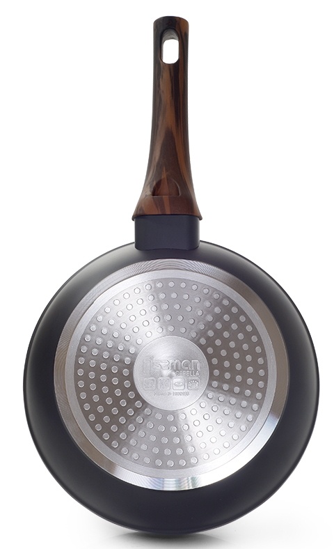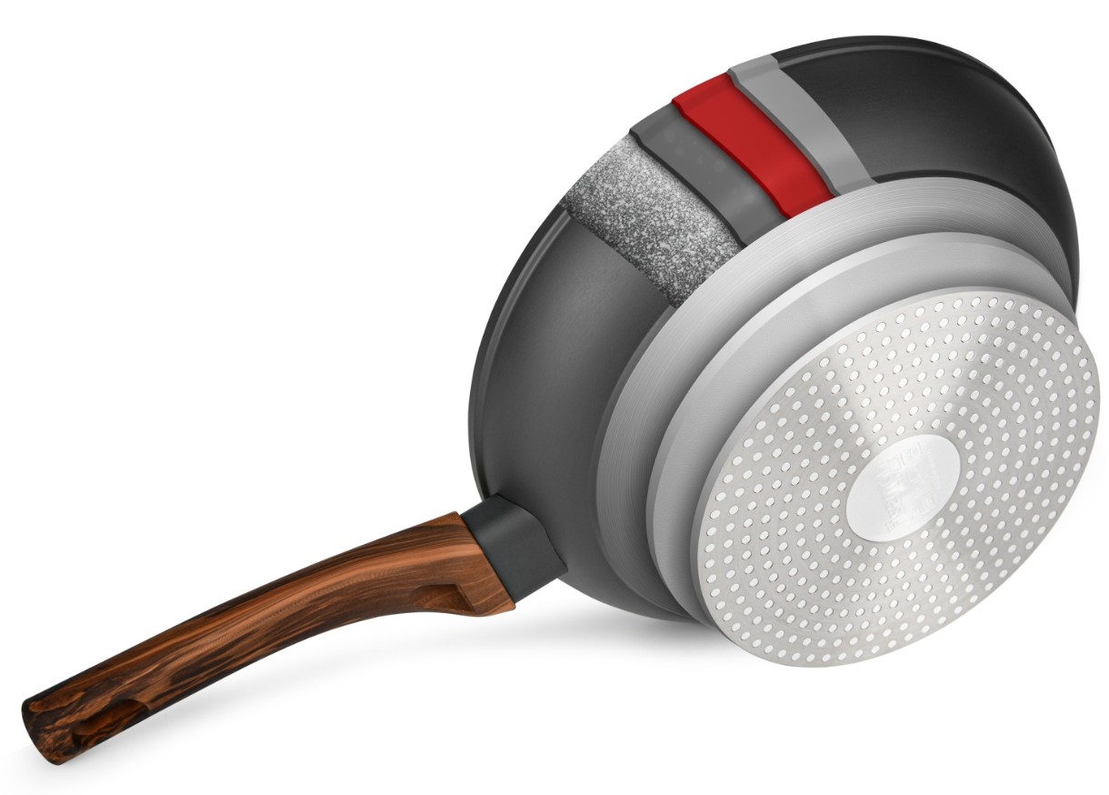 Бакелитовые ручки с эффектом soft-touch, выполненные в благородном коричневом оттенке ‘под дерево’, приятны на ощупь, не скользят в руках, не нагреваются во время готовки.