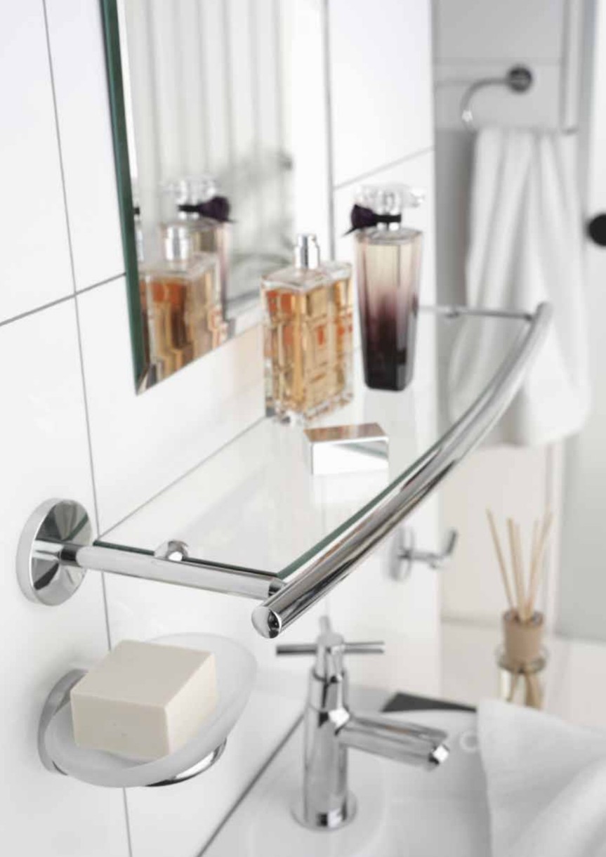 Полка стеклянная настенная, скрытое крепление на шурупах, в комплекте. Изготовлена из матового стекла и стали с качественным хромированным покрытием, которое на долго защитит изделие от ржавчины в условиях высокой влажности в ванной комнате. Отлично сочетается с другими аксессуарами из коллекции "Capri".
