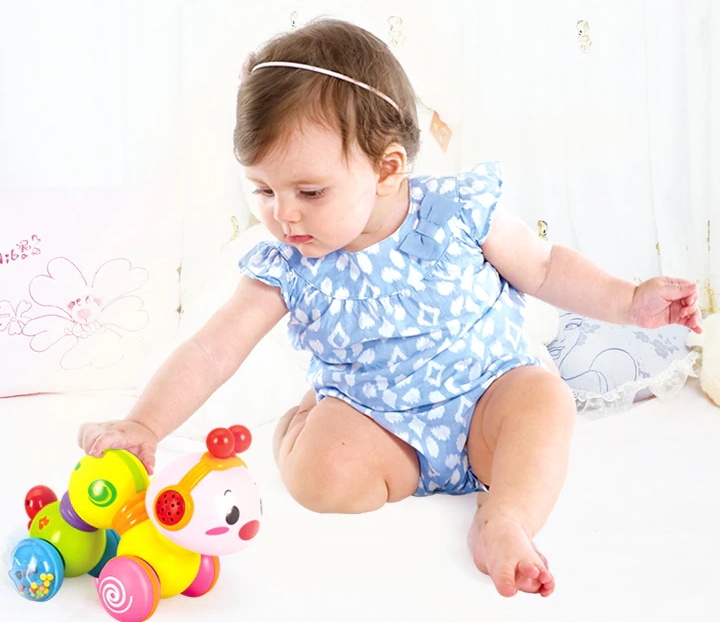 Музыкальная гусеничка станет отличным компаньоном для начинающего ползать малыша. Игрушка движется благодаря колесикам, на голове мигают огоньки. Нажав на кнопку на наушниках, можно полушать мелодии. Голова гусенички вращается на 360 градусов с забавным звуком.
