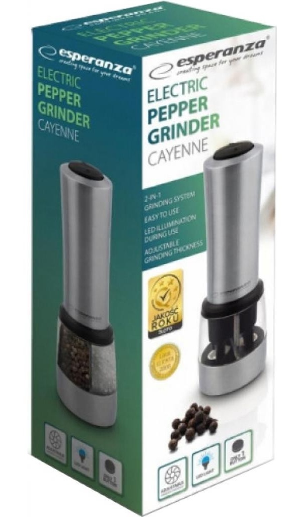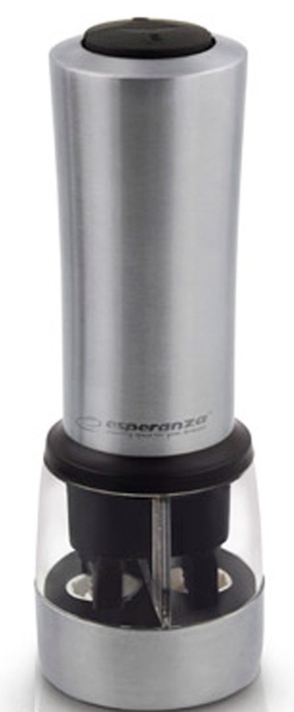 Электрическая мельница для специй Esperanza, отличный помощник на кухне для любой хозяйки. Мельница для перца и соли облегчит ежедневные действия на кухне. С помощью одной кнопки, она размелет специи в считанные секунды, а чтобы помол вышел нужного размера, предусмотрена регулировка степени помола. Работает мельница от 6 батареек типа ААА (батарейки в комплект не входят).