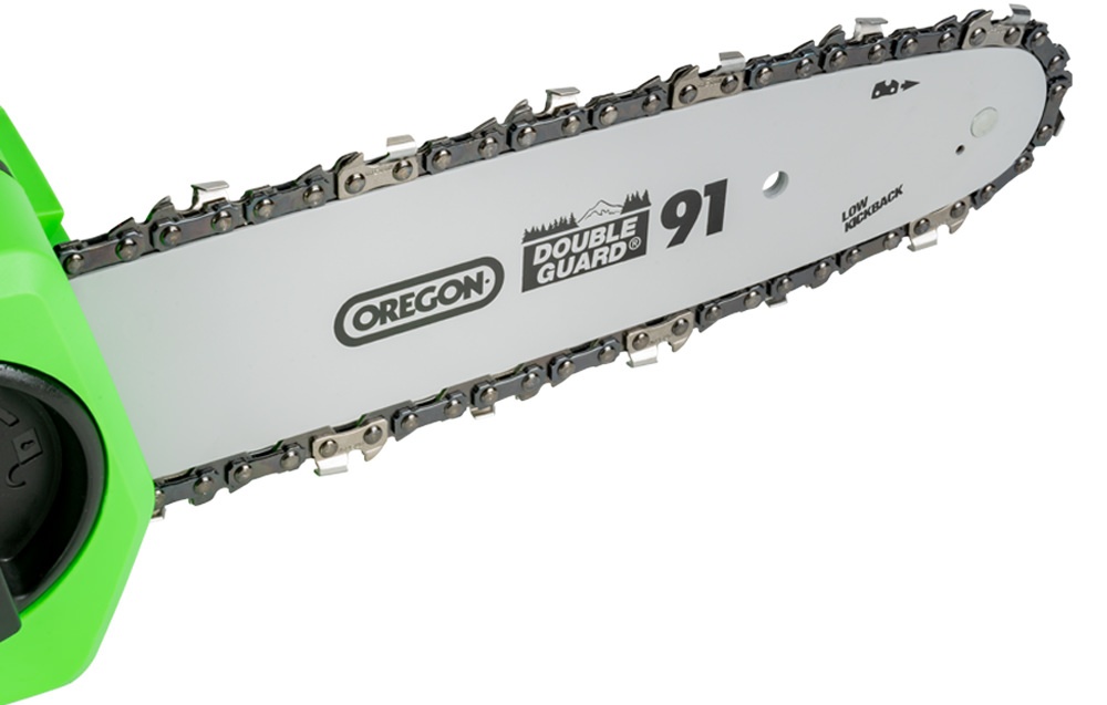 Она оснащена ручкой для регулировки направляющей шины и натяжения цепи, цепным тормозом для остановки цепи в случае отдачи, а также уловителем цепи, чтобы поймать ее, если она сорвется или соскочит. Кроме того, инструмент оснащен автоматической системой смазки цепи и кнопкой блокировки куркового выключателя, чтобы избежать случайного включения инструмента. В комплект также входят направляющая шина, цепь и чехол для защиты шины и цепи при хранении и транспортировке.