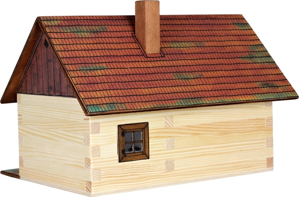 Конструктор для постройки миниатюрного традиционного дома из настоящих бревен. Этот набор для 3D-работ по дереву поставляется с деревянными блоками разной длины, строительными деталями для строительства крыши, окон, дверей, другими компонентами и инструкциями по пошаговым схемам, то есть пиктограммами, с символами для отдельных рабочих действий.