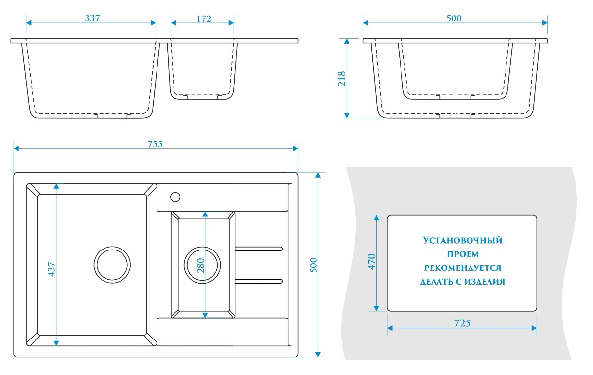 Размер мойки755x500 мм