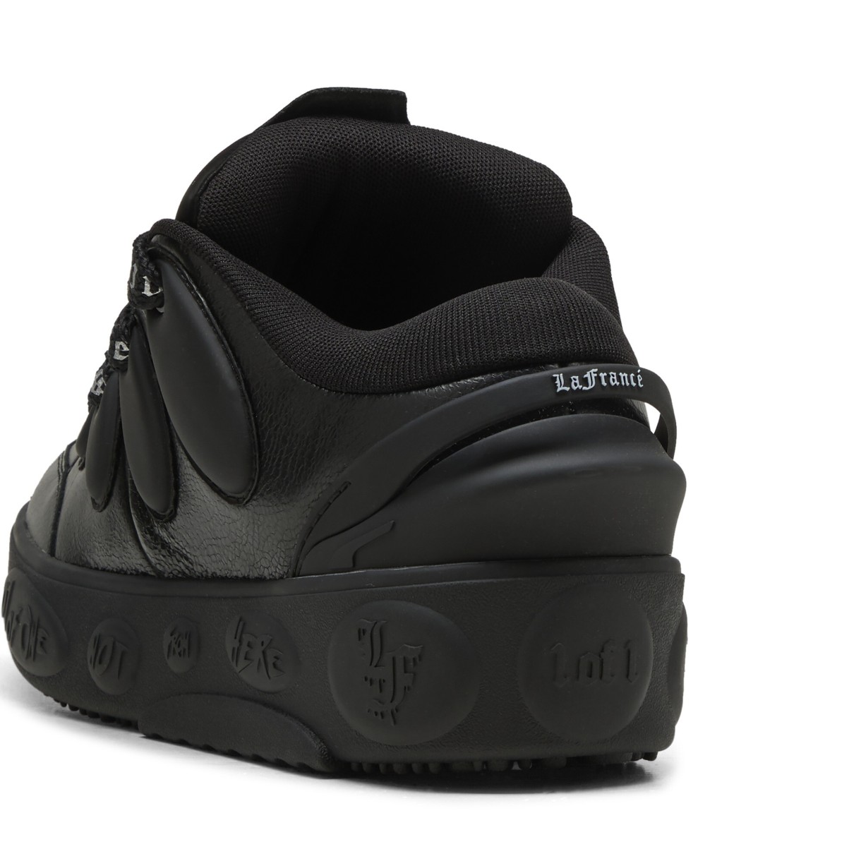 Вы будете блистать. Вдохновленные стилем скейтеров, эти массивные кроссовки привлекают внимание слоганами Ламело на подошве и межподошве, а также его личным брендом LaFrancé. Эта модель в черном варианте привлечет к вам внимание блестящей кожей. Система шнуровки LaFrancé добавляет еще один популярный элемент стиля в ваш повседневный гардероб.