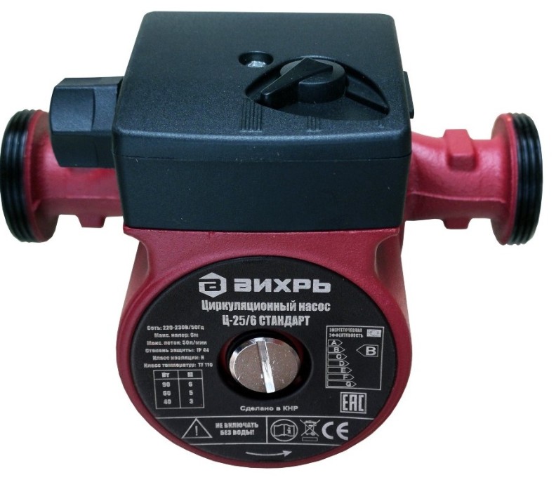 В названии циркуляционных насосов Вихрь отражены два параметра, например: Ц-25/4. Первые две цифры — это диаметр присоединительных патрубков. В нашем случае 25 мм (1 дюйм) — диаметр резьбы гаек, поставляемых в комплекте с циркуляционным насосом. Он должен соответствовать диаметру труб (переходников) в системе отопления. В системах отопления наиболее распространены два диаметра - 25 и 32 мм. Второе число обозначает максимальный напор насоса. В нашем примере максимальный напор составляем 4 м, то есть он может создавать избыточное давление до 0,4 атм. Этот параметр должен превышать расчетный напор требуемый для системы отопления. Пример упрощенного расчета требуемого напора будет приведен ниже. Потребляемая мощность циркуляционных насосов регулируется ступенчато (3 положения). Мощность и максимальный напор для каждой ступени указан в таблице на корпусе насоса. Кабель питания подключается к клеммной колодке и в комплект не входит.