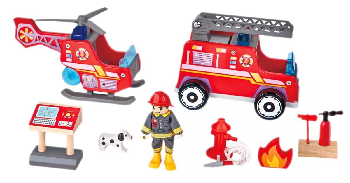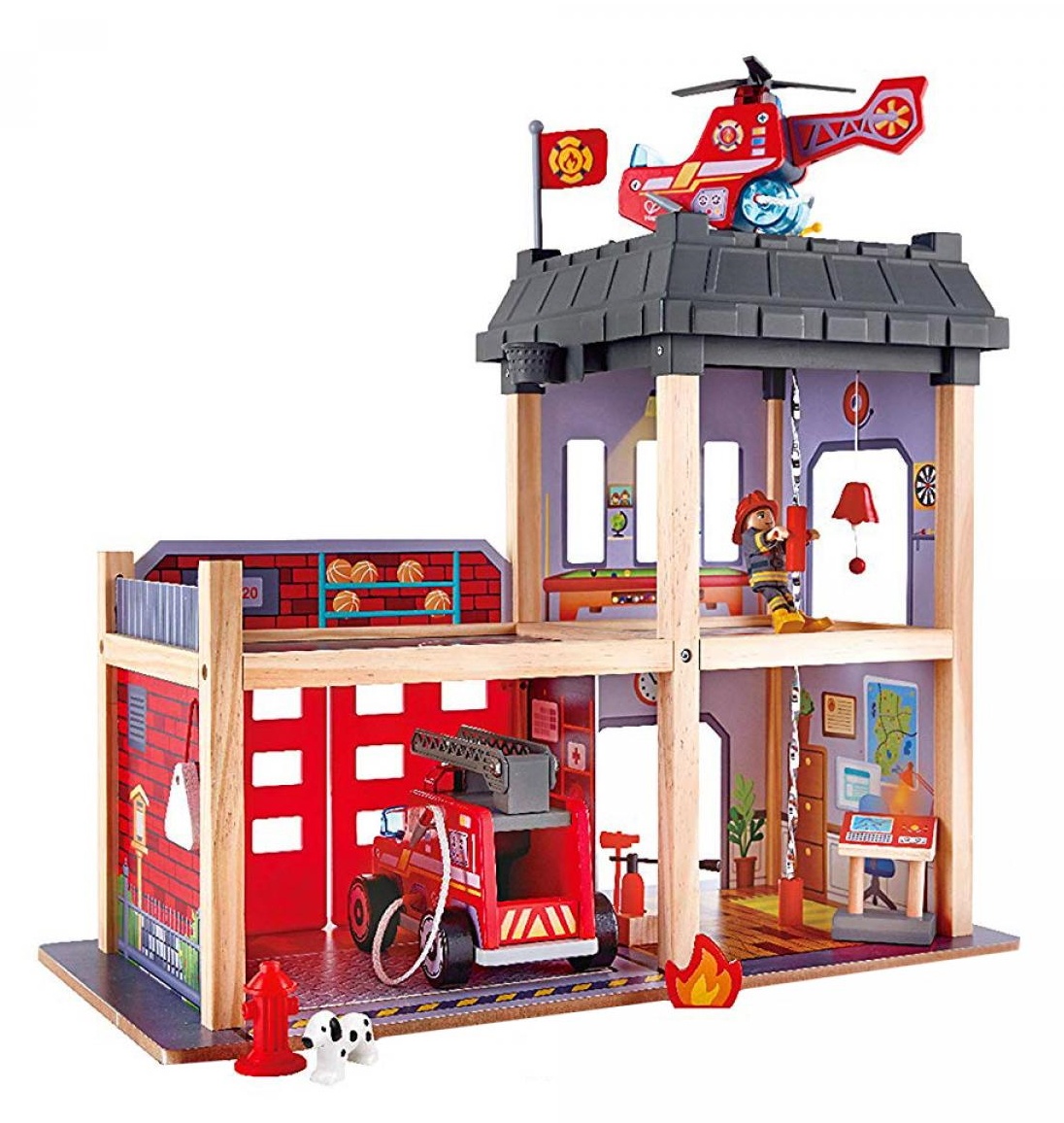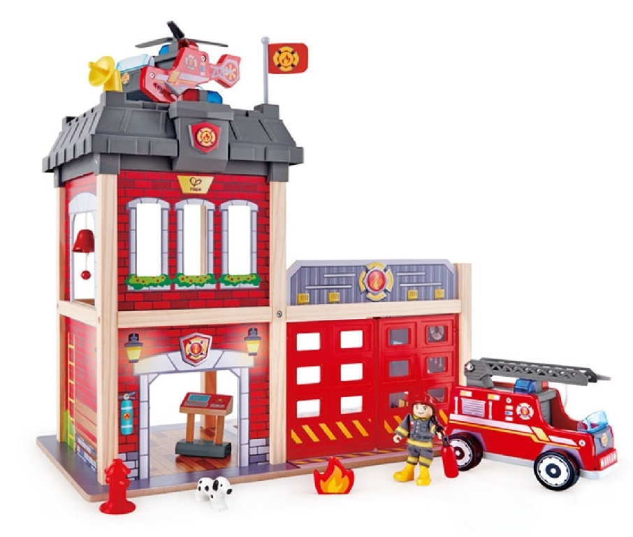 Набор «Пожарная часть» (HAPE E3023) - создан для детей, которые хотят почувствовать себя участником действий подразделений, обеспечивающих безопасность в городе – пожарных. Теперь для выполнения заданий у него есть штаб-квартира для выполнения различных спасательных операций, которая имеет все необходимое – двухэтажное здание, с кабинетом начальника, дежурной частью, гаражом и даже посадочной площадкой для вертолета. Оборудование высшего класса – компьютер, пожарная машина и вертолет. Предусмотрен даже специальный винтовой спуск из комнаты отдыха пожарного экипажа в гараж.