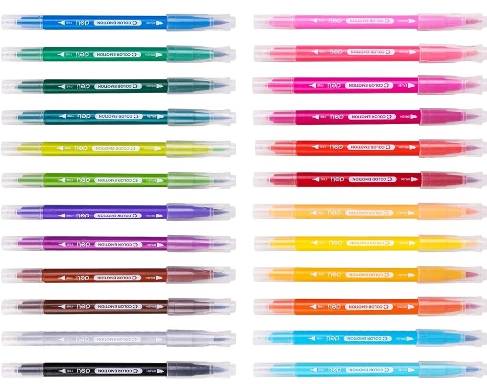 Двусторонний фломастер с тонким линером на одном конце и кисточкой на втором. Отстирываемые чернила. Улучшенное расположение фломастеров для удобного использования.