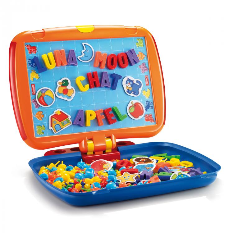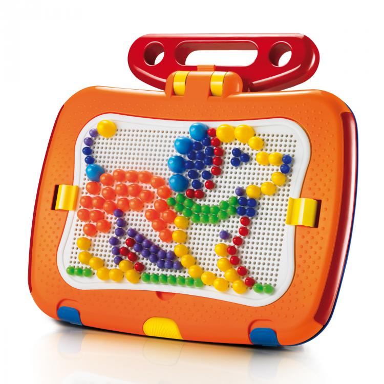 Набор упакован в чемоданчик, крышка которого является основой для игры. Перфорированная сторона основы предназначена для создания объемных картинок из 300 разноцветных пластиковых "гвоздиков" со шляпками разного диаметра, представленных семи цветов: голубого, красного, салатового, фиолетового, синего, оранжевого и желтого. Для этого ему нужно лишь вставлять "гвоздики" в основу на примере приведенных в буклете изображений или так, как подскажет фантазия. Обратная сторона основа является магнитной, оформлена рисунками и служит для прикрепления к ней 12 картонных элементов с изображениями животных, фруктов и различных предметов и 48 букв с магнитными основами.