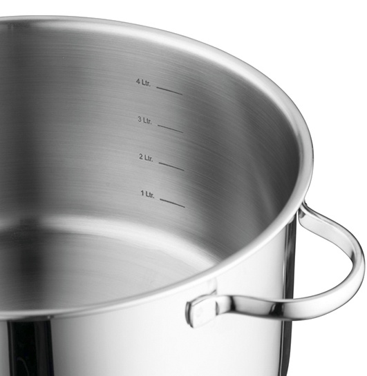 Имеет зеркальную полировку снаружи и матовую внутри. Трехслойное капсульное дно не деформируется при нагреве и обеспечивает быстрое и равномерное распределение тепла. Благодаря толщине боковые ручки не нагреваются. Стеклянная крышка с отверстием для выхода пара позволяет контролировать весь процесс приготовления в оптимальном режиме.