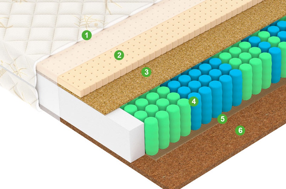 Пружинный блок "Medizone R1000" Уникальный блок независимых пружин из омедненной стали. Благодаря своим биметалическим свойствам оказывает оздоровительное воздействие на весь организм. Нагрузка распределяется по всей площади матраса равномерно, обеспечивая оптимальный ортопедический эффект. Производитель - "Agro" (Германия). Латекс Натуральный материал, получаемый путем вспенивания сока каучукового дерева. Мягкий, гигиеничный и хорошо вентилируемый, он обеспечивает упругую поддержку позвоночнику. Производитель - “Artilat” (Бельгия). Orto Hemp Натуральный экологически чистый материал из конопляных волокон, который произведён по иглопробивной технологии, надежно скрепляющей их в однородный плотный слой. Используется для придания матрасу необходимой степени жесткости, при этом обладает повышенной гибкостью и отлично подстраивается под контуры тела спящего. Кокосовая койра Натуральный материал, состоящий из спрессованных волокон кокосового ореха, полностью пропитанных латексом. Слои из прочной и долговечной кокосовой койры используются для придания матрасу дополнительной жесткости. Производитель - “Enkev” (Нидерланды). Мебельная сетка Защитная прослойка, которая используется для разделения пружинного блока и мягких слоев матраса, сохраняя их от износа. Чехол Чехол из экологичной трикотажной ткани Bambootex одновременно обладает мягкостью и исключительной прочностью. Благотворно воздействует на кожу и создает оптимальный микроклимат спального места. Сохраняет свойства после многочисленных стирок. Производитель - “Bodet&Horst” (Германия).