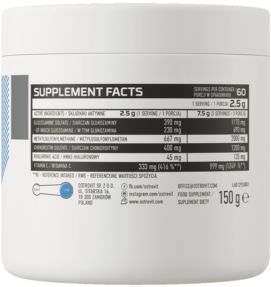 OstroVit Глюкозамин + МСМ + Хондроитин это высококачественная пищевая добавка, которая является источником глюкозамина, хондроитина, МСМ, а также гиалуроновой кислоты и витамина С. Это препарат с восхитительным малиновым вкусом, доступный в порошковой форме и не содержащий добавленного сахара. Продукт предназначен для спортсменов и людей с повышенной потребностью в ценных соединениях.