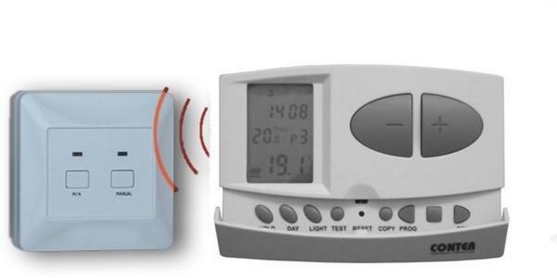 Термостат CONTER CT7W имеет беспроводной тип подключения. Состоит из двух частей: передающей и приемной, которая непосредственно подключается к газовому котлу. Подключение универсальное. (Сигнал, на контактах реле, нормально открыт или нормально закрыт.) Данная модель термостата оснащена цифровым управлением и информационным LED дисплеем. Позволяет программировать температуру разными программами на каждый день недели не зависимо от других дней. Дневная программа состоит из шести периодов P1 до P6, шестью различными температурами.