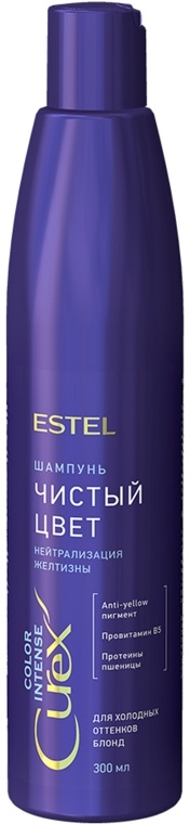 Шампунь Curex Color Intense от фирмы Estel — это профессиональное оттеночное средство для ухода за волосами. В результате вы получите качественное очищение и обновлённый тон. Фиолетовый пигмент усиливает холодный серебристый оттенок на светлых и осветлённых волосах и нейтрализует желтизну. Объём шампуня — 300 мл