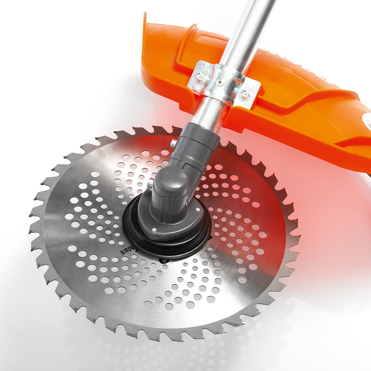 Режущий диск изготовлен из высокопрочной стали с твердосплавными напайками. 40 зубьев позволяют использовать его для кошения жесткой травы, кустарника и тонких стволов деревьев.